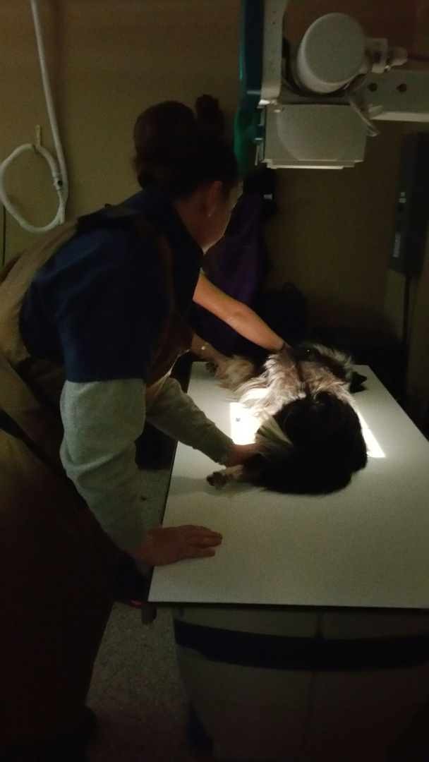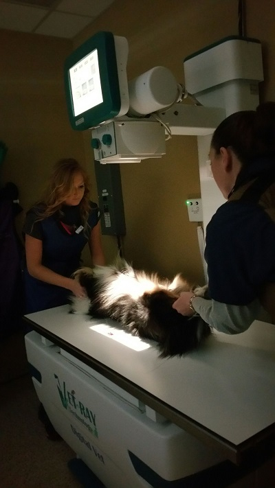 As you can see in the pictures our Veterinary Technician's, Brianna and Kelly, take the radiographs. They take a lateral view, which is Bandit laying on his side; and a ventral dorsal view, which is Bandit laying on his back. After several radiographs spaced out over several hours, Dr. Hook is able to see that there was no apple core stuck in Bandit. This was great news for Bandit and his pet parents! After eating and drinking on his own with no vomiting, Bandit was able to go home that evening.
